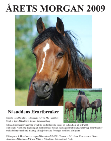 Näsuddens Heartbreaker 071 får priset för sin fantastiska insats att ta hand om ett extra föl. När Ekens Anemone tragiskt gick bort lämnade hon en vecka gammal fölunge efter sig. Heartbreaker tvekade inte en sekund utan tog till sig den extra fölungen med hela sitt hjärta. Fölungarna är Heartbreakers egen Näsuddens MMIX L’Amore e. SC Island Centavo och Ekens Anemones Näsuddens Miracle Mike e. Näsuddens International Pride.