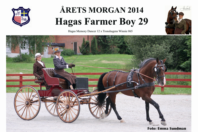 Farmarpojken har under flera år visat att han är en god representant för Morganrasen. Han har deltagit, och vunnit, flera körtävlingar och dessutom tävlat framgångsrikt i dressyr. Många som sett honom har fått upp ögonen för rasen. Farmarpojken som nu är kastrerad var tidigare en godkänd hingst och har fyra renrasiga avkommor. Vi gratulerar ägaren Veronica Isaksson och uppfödaren Haga Morgans.