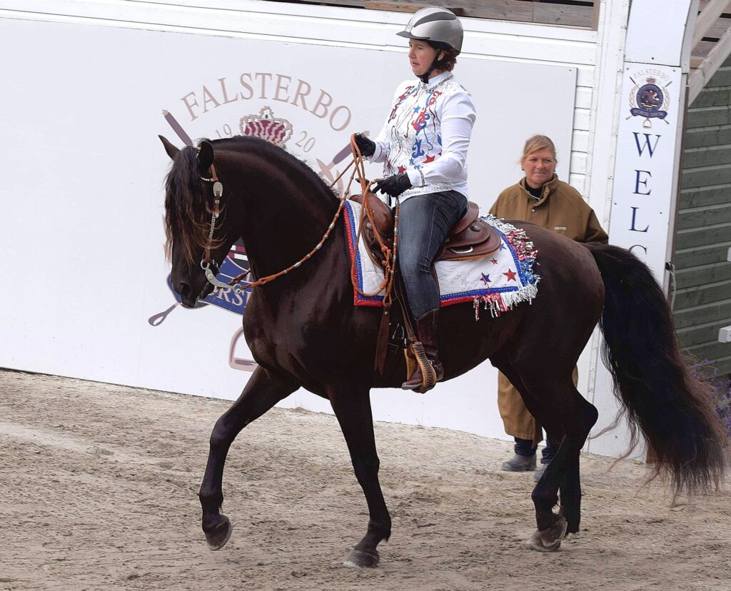 | Meriter | Utställning Region Syd 2018: 8 9 8 7 8= 40p. 2020: 8 8 8 8 8 =40p. Reserv Bästa Vuxna Hingst Riks 2016. Tävlad i Western Dressage med vinster, Working Equitation LB, Western Riding och Trail med placeringar. Utbildas vidare inom körning, WE, hoppning och western. |